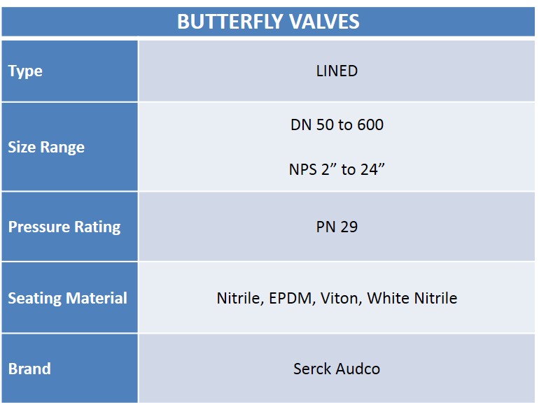 The Audco Butterfly Valves are ideal for precision throttling and on-off applications, especially in lighter-weight piping systems, the Audco family of butterfly valves is often specified for its versatility. Outstanding throttling accuracy for process control is achieved through low-friction, erosion resistant sealing surfaces with very low operating torques.